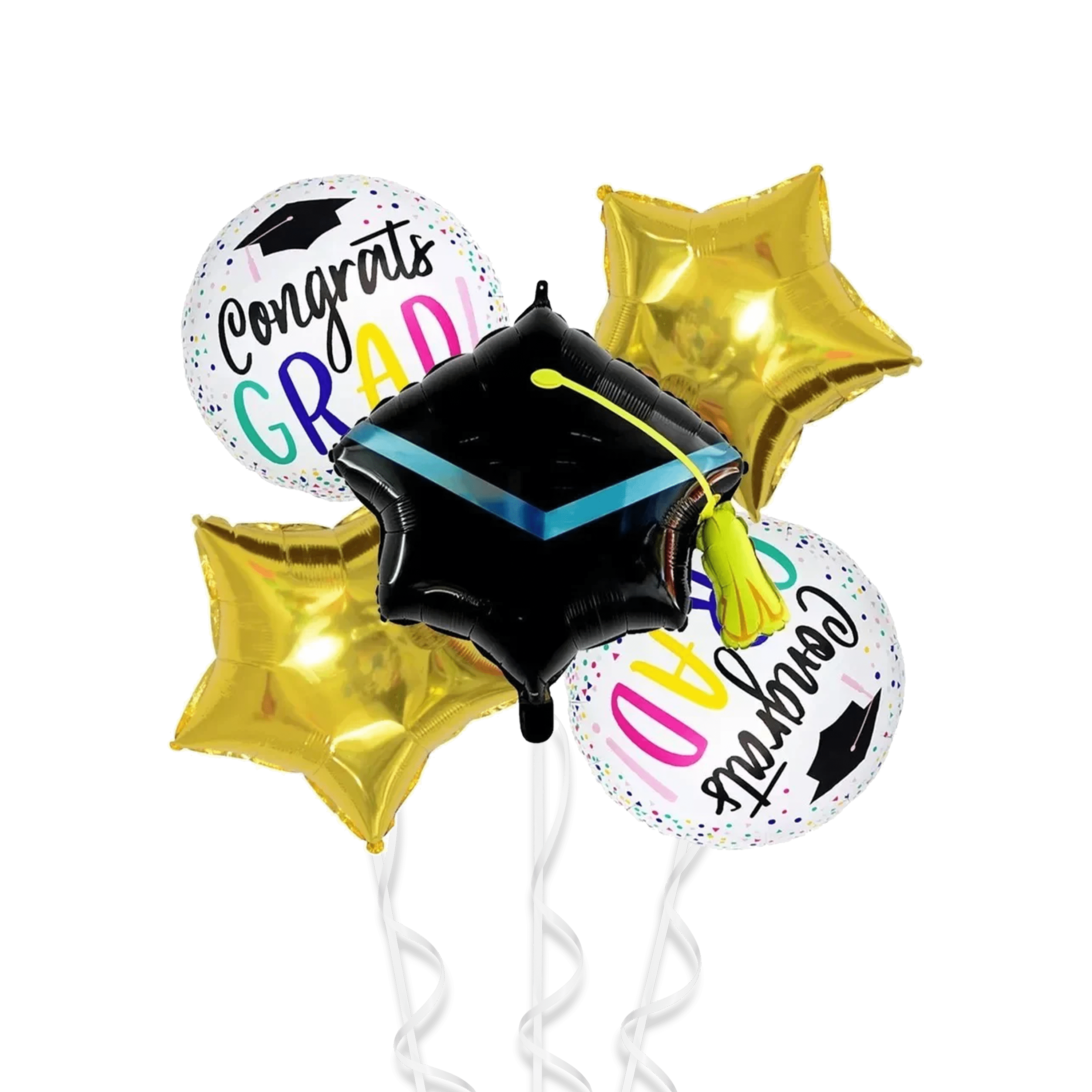 Includes a mix of helium-filled balloons with congratulatory messages, star shapes, and a graduation cap balloon – perfect for photos, parties, or pairing with gifts.